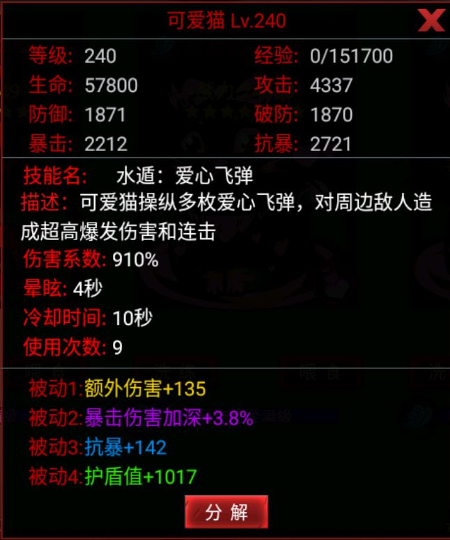 24.可爱猫,属性水,技能:发射爱心飞弹造成伤害并眩晕敌人4秒(满星4秒),冷却时间10秒,使用次数9次(满星9次)。
