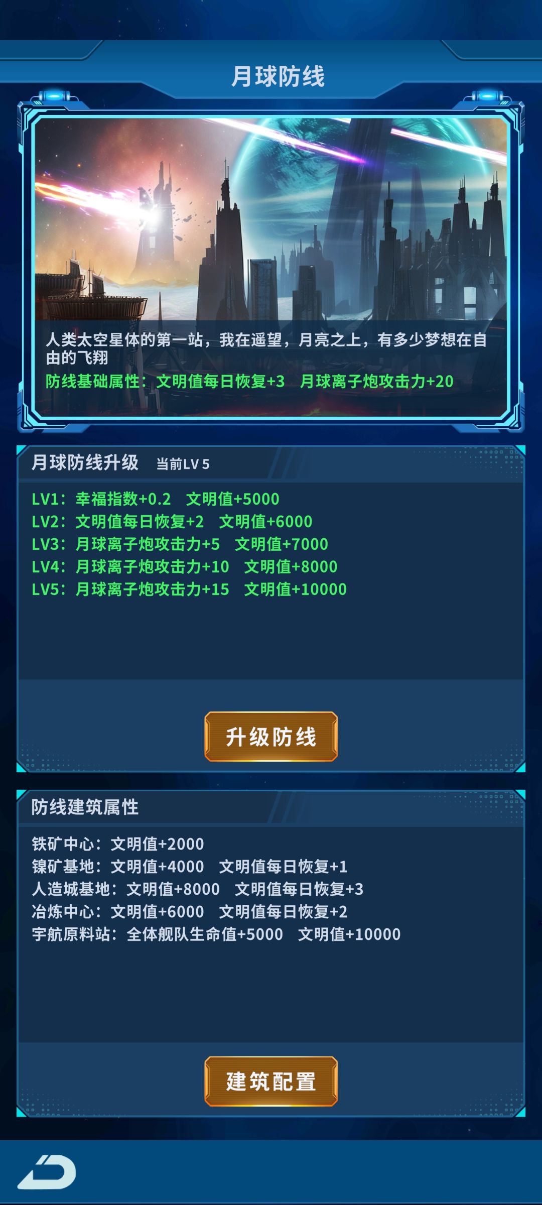 目前开启的四个防线,如果40岁开始建造建筑,55岁左右就会有总共9个可选建筑加一个赠送建筑,共计10个,每个舰队五万舰队值的增加。
