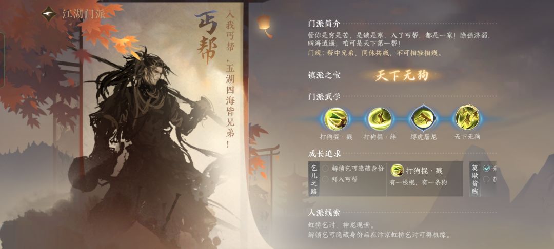 加入方式:身份挖矿达到1级,装备趣味技能乞讨,乞讨成功后解锁隐藏身份乞丐,前往汴京(1012,1027)虹桥乞讨,乞讨成功后刷新老乞丐,给钱后触发奇遇丐中之丐,接着去汴京(1140,1357)点火堆打狗,随后前往杭州(860,927)找裴七斗,接着在杭州(737,1403)找鲁八拜,完成后续指引后加入丐帮。