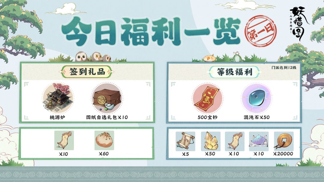 七日签到的福利别忘领取~今日签到后可获得建筑图纸桃源炉、图纸自选礼包等礼品,等级达到12级,还能从邮件里获取宝钞、混沌石,还有诸多材料哦!!顺便透露一下,明天可以领取稀有门客大猫小萝,若是门派等级升至20,还可获得大量宝钞和材料!