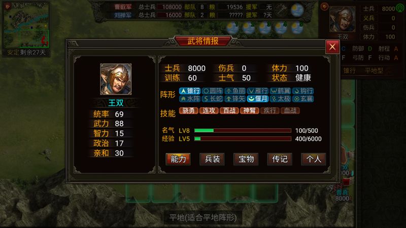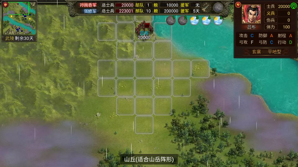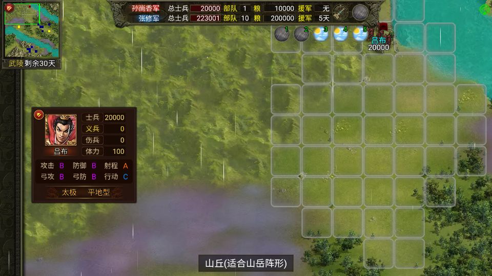 (注:下一步我以此来推测各阵型通过各个地形的消耗,稍有所得,但目前困扰我的是雨天影响移动力的问题,似乎各阵型影响的因子并不一样,极有可能问题就出在我的取整上,或者是雨天影响因子为一个公式上,这有待深入研究,希望大家有研究或者有兴趣的给予我指正!先行感谢!)