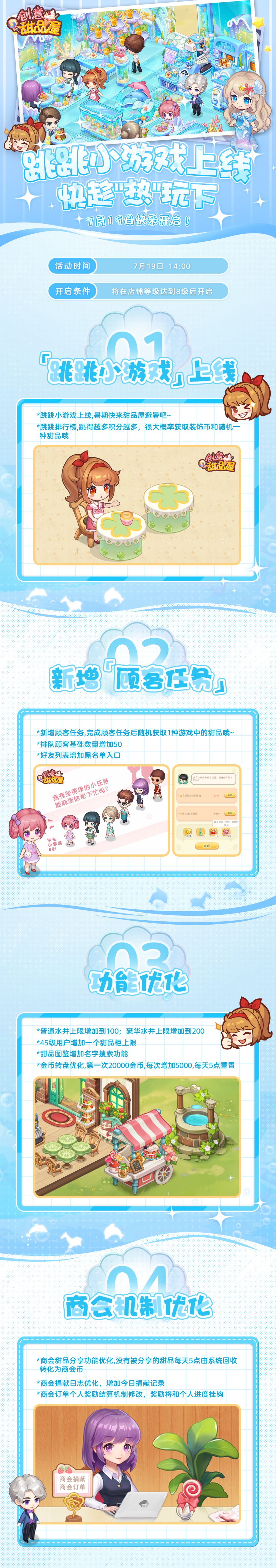 继上一次为店长们,奉上六一新版本的情报后,管家就马不停蹄地为店长们继续收集着,甜品屋各项情报的消息!根据管家这次收到的最新情报,本次「跳跳小游戏」新版本不仅有魔性好玩的小游戏外,更有——新增顾客任务、水井升级、商会分享功能优化...等着大家前去一探究竟!(ノ´▽`)ノ♪快随管家一起康康吧!