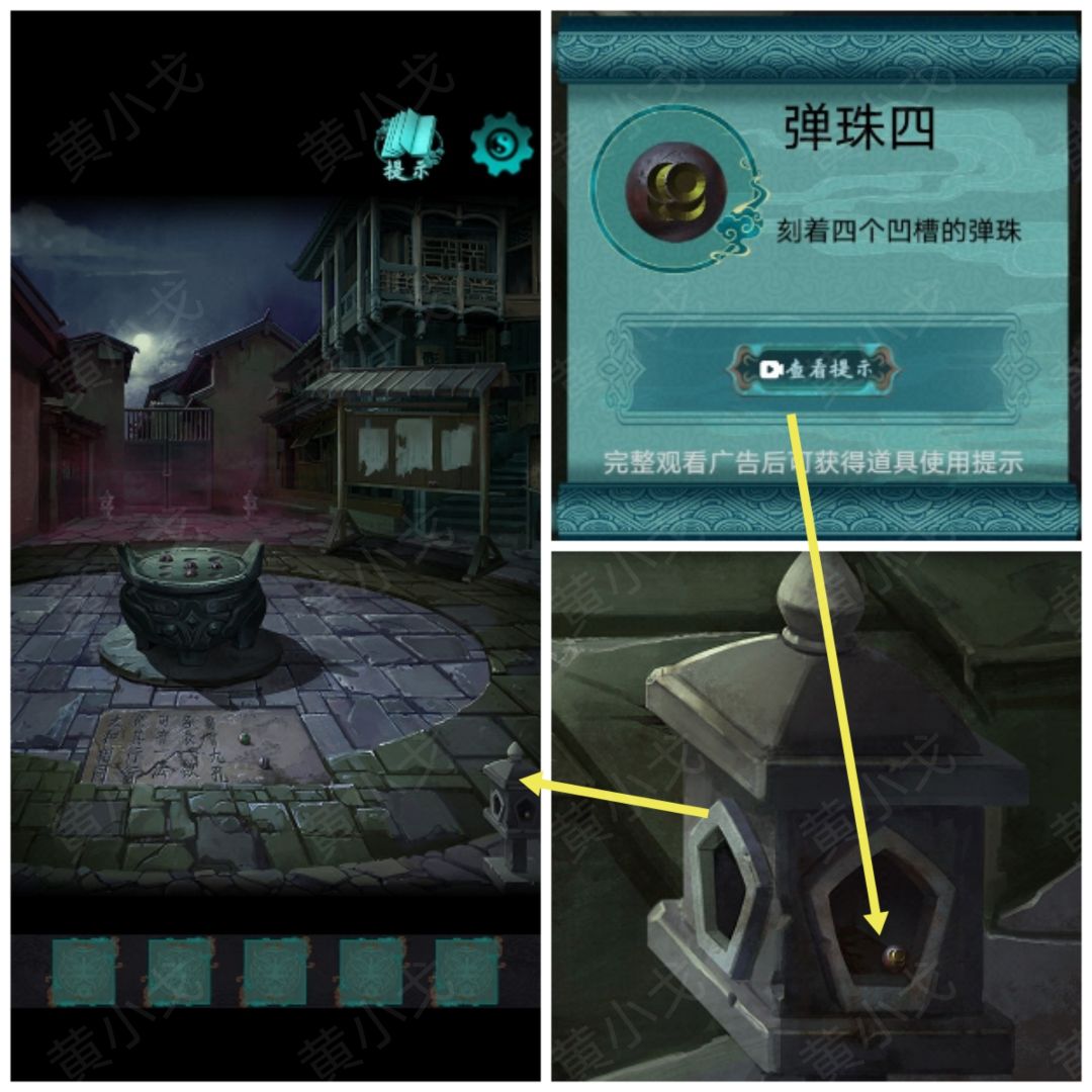 4.点击鼎,根据上面固定的弹珠(弹珠上的凹槽代表弹珠数)和地砖上的字,把五颗弹珠放入正确的位置上(294 753 618)