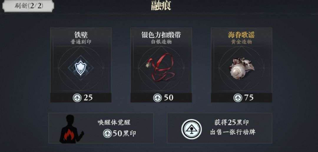 融痕兑换次数不限制,但黑印有限,理论上兑换顺序造物>觉醒>普通刻印,也可以出售行动牌换取黑印点数