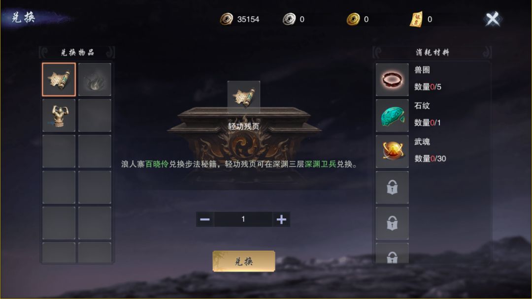 三层的NPC处可以合成轻功残页(兽圈*5,石纹*1,武魂*30)。