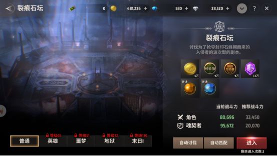 裂痕石坛分为普通、英雄、噩梦、地狱、末日Ⅰ这5个等级,难度等级越高道具产出越好。在20~40级,勇士们可以体验到的是普通裂痕石坛。