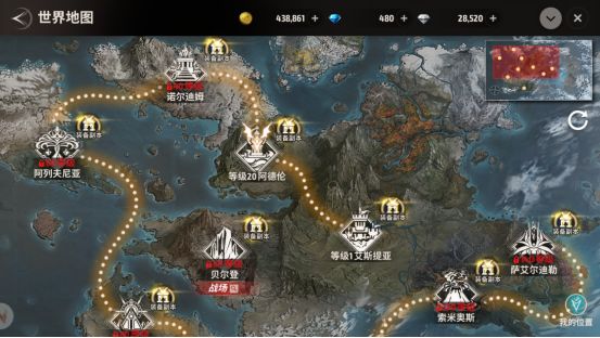 点击右上角的【地图】,再进入【世界地图】,可以看到每个地区都有对应的装备副本。