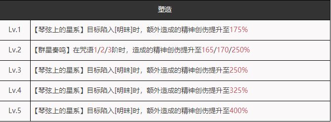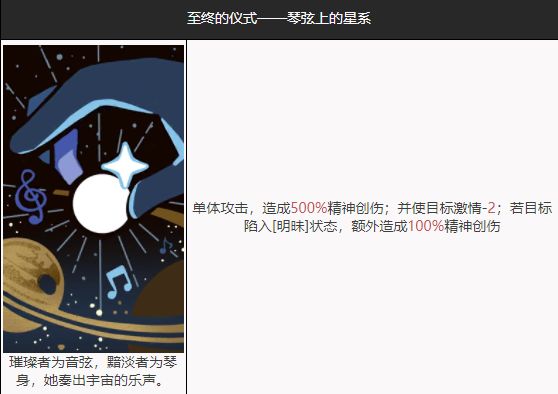 作为单体攻击的至终仪式,该神秘术的基础倍率处于中游的一档。(红弩箭为700%,梅兰妮为650%)作为一个辅C角色,相对而言还是可以接受,额外特效为,使目标激情-2;若目标陷入[明昧]状态,额外造成100%精神创伤。