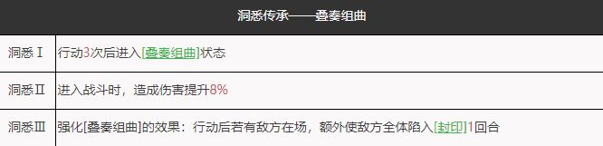 洞悉三时,远旅获得被动:强化[叠奏组曲]的效果:行动后若有敌方在场,额外使敌方全体陷入[封印]1回合。([封印]:无法使用至终的仪式)。