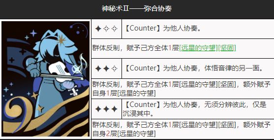 群体反制,给全队施加一个反制状态:[远星的守望]([远星的守望]:对攻击者造成远旅攻击*100%的本源创伤(生效后减少1层))以及一个状态增益:[坚固]([坚固]:被攻击时,受创减免+25%(生效后减少1层))
