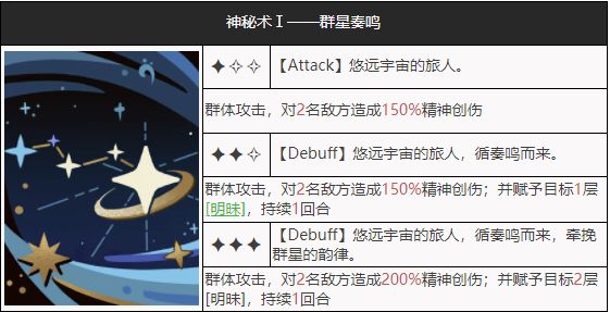 远旅的神秘术I在一阶时,是标准的群体神秘术的倍率,二星时则亏损了75%换来了额外特效:赋予目标一层[明昧]。([明昧]:抗暴率-25%(效果可叠加,每层时间独立计算))