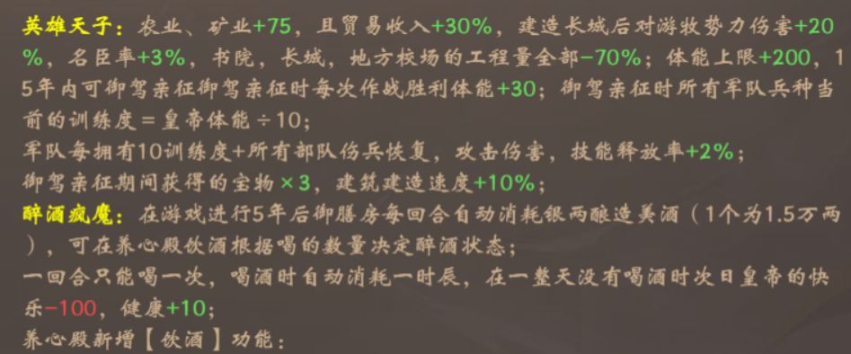 本纪思路及难点:开局13座城池,经济可以,且技能影响,贸易收入+30%,所以也可以使用贸易流来提升经济。游戏第六年开始,每回合必须喝酒,不喝酒-100快乐值,这个负面buff还是蛮多的。御驾亲征状态下,体能属性和军队训练度挂钩,也就是体能越高军队训练度越高。所以要尽早的把武力和体能刷满。