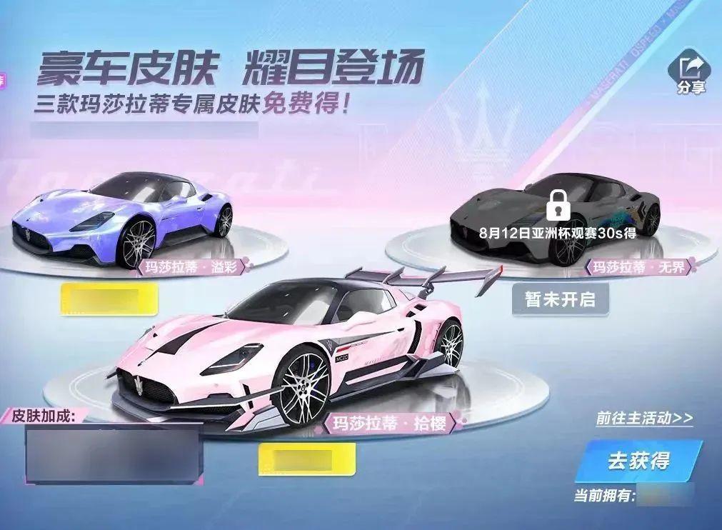 玛莎拉蒂三款专属皮肤!全民免费送!