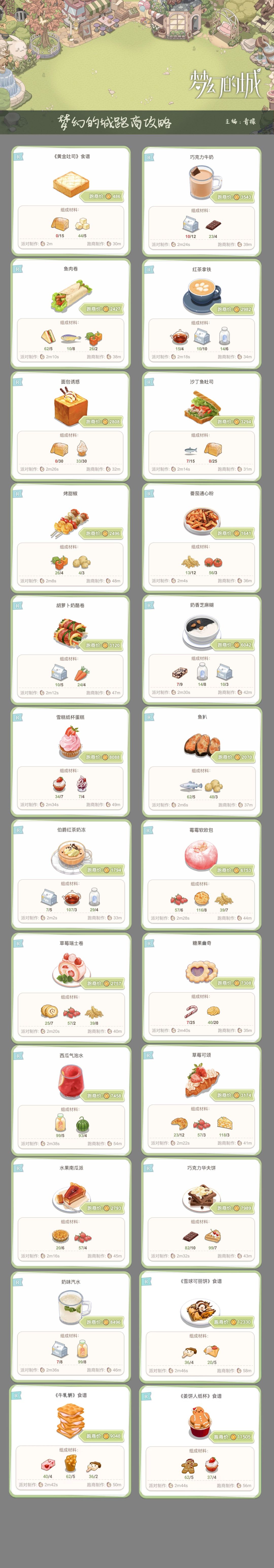菜谱素材有鱼、蔬菜、食物,分别从钓鱼、家族田地、工厂获得。菜谱可以在跑商仓库中的限时商店购买,也可以在每次参加派对的派对商店购买。