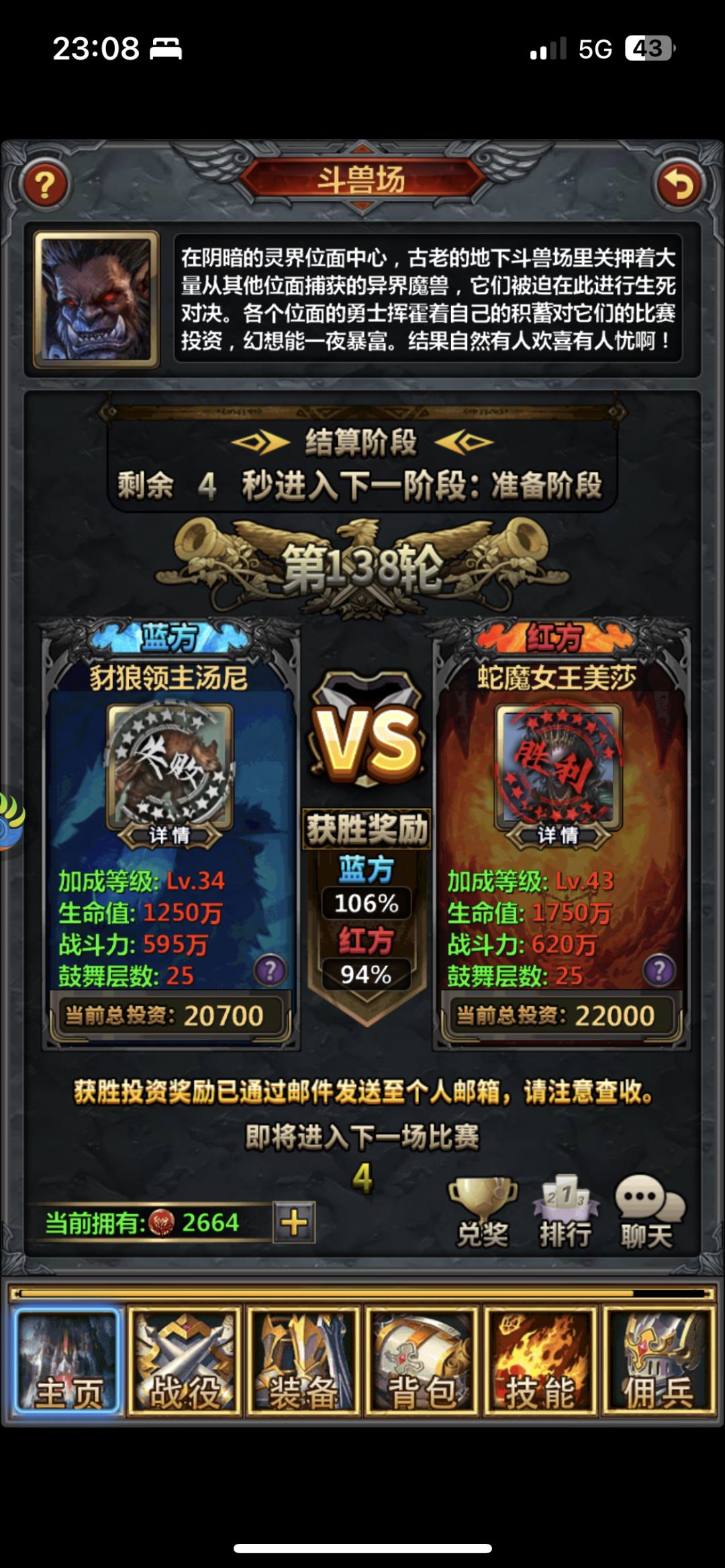 斗兽需要消耗斗兽币,斗兽币可以通过活跃度宝箱获得,在100级或者v13后也可以通过金币钻石代金券购买。斗兽每轮一共十分钟,左右两边都可以押注。每次最多可押注5000斗兽币。至于那一方能获胜,主要还是要看运气,赌嘛,你懂得,决定哪一方可以获胜是由战力,技能以及特效决定,其中战力决定的比重大一点。