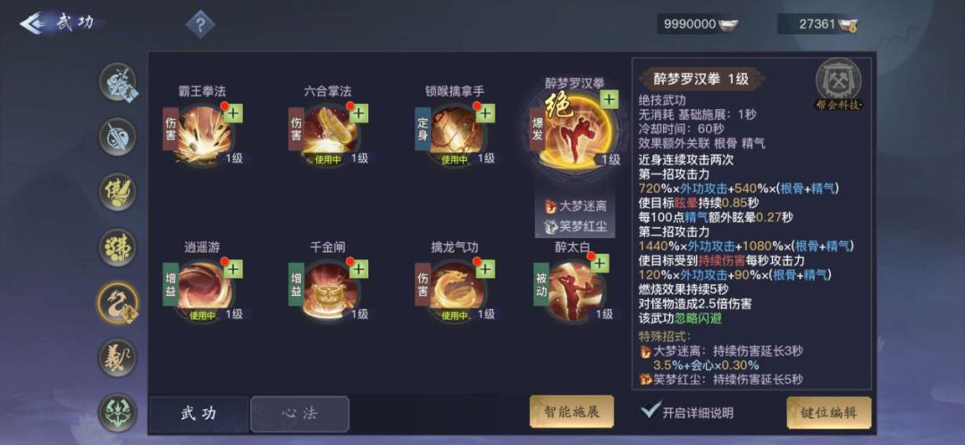 出神入化:推荐凌波微步,增加移动速度,被动触发,平时没事跑图的时候非常方便。战斗时也能增强凌云的灵活性。龙象秘籍也可以,被动增加五项全属性和生命值。一个比较灵活,一个比较实用。