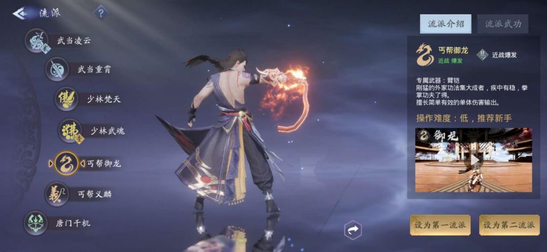 丐帮御龙是比较典型的近战暴力输出型战士,武功技能还有不错的控制效果和增益效果。生存力上虽然有一些欠缺,但是可以通过技能和操作性来弥补,是一个比较热门的输出型流派。在养成方面,还是推荐以攻击为主,发挥出御龙高攻击的优点。