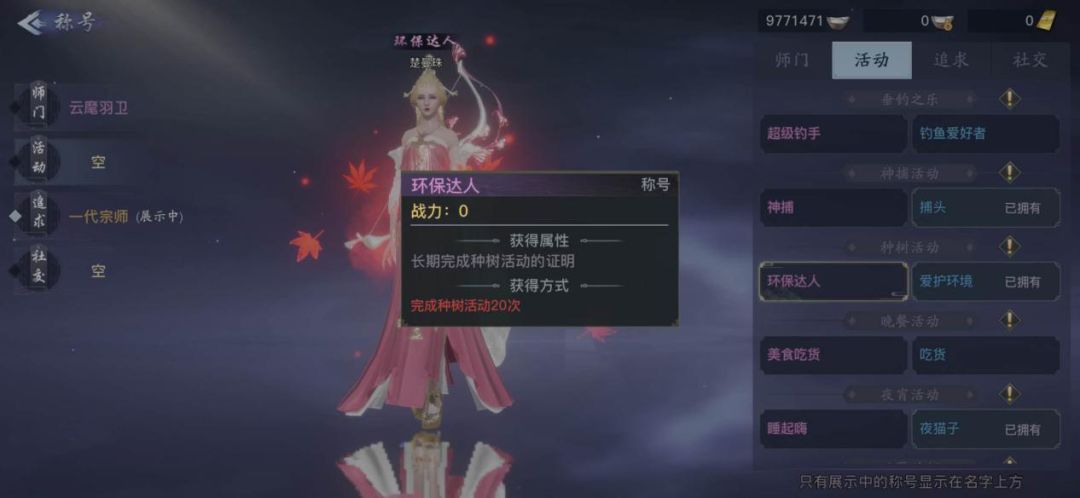 除了果实的奖励外,种树活动还有专属的称号奖励,完成种树活动三次,获得蓝色品质称号“爱护环境”,完成种树活动20次,获得紫色品质称号“环保达人”。
