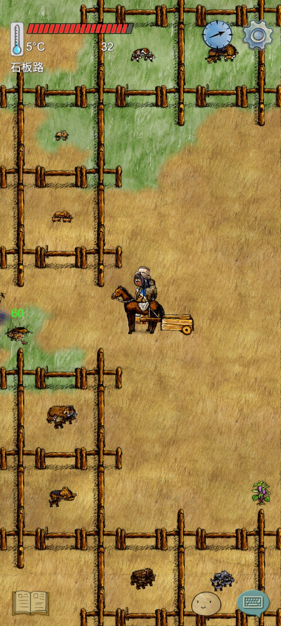 3.拴好马,抱起崽崽进入犬舍,点击栅栏门关门,点击猪肉丝交换二者位置,把手里的肉丝喂给崽崽,碗塞到背包里,把羊肉拿在手里等待狗狗长大,长大后喂羊肉,狗狗会怀孕,生下崽崽后会不再移动,此时可以放心开门出去。