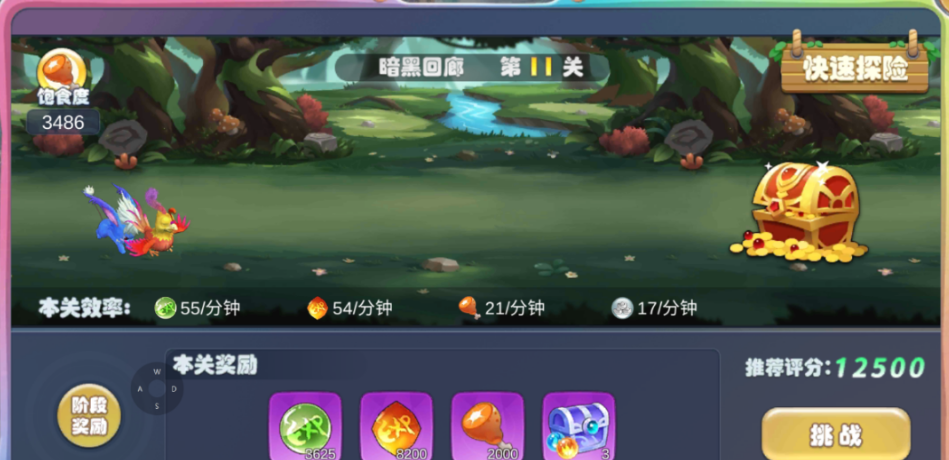 游戏中类似爬塔的玩法—勇闯魔界。根据层数决定每分钟的挂机奖励,奖励可以点击图中的宝箱一键领取,另外还可以通过快速探险额外获取2小时奖励,每日免费赠送一次快速探险。后续需要消耗梦玉才可以快速探险。
