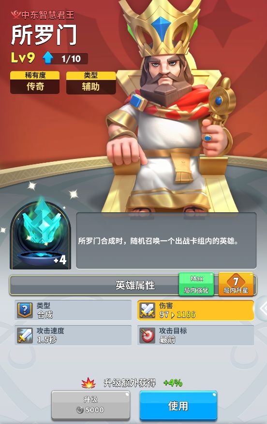 所罗门的英雄定位是辅助英雄,局内升星和强化可以提升基础伤害,作为辅助英雄伤害较低,且升星和强化后技能效果并没有提升,在对局中升星和强化的优先级较低。