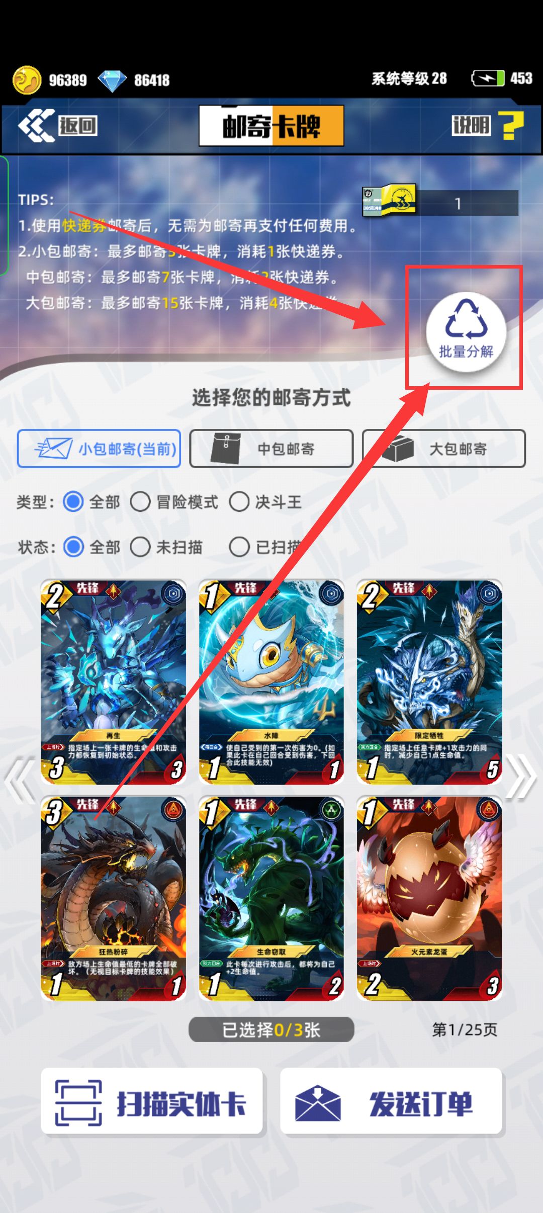 不需要的实体卡,可以在五维商店——邮寄实体卡界面进行分解。关于快速分解功能:首先需要选择【批量分解】