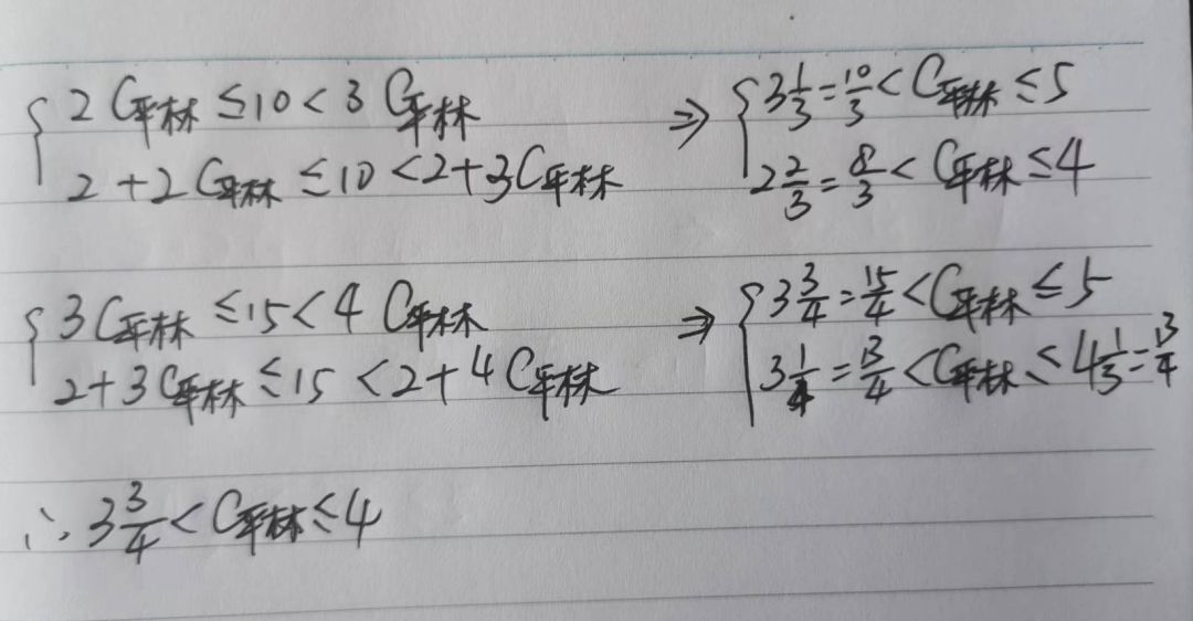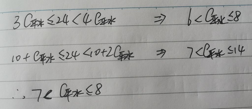 同样,确定了M水=12,我们可知上图2C水山+C水林≤22<3C水山+C水林,即2C水山+6≤22<3C水林+6,得5<C水林≤8
