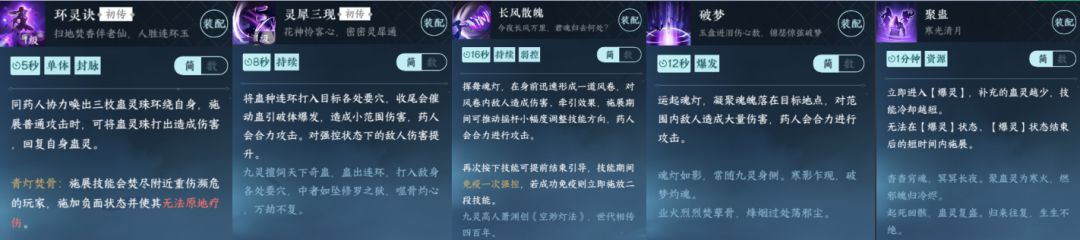连招先释放环灵诀加灵犀三现然后聚蛊加特殊技能幽火如昼,这个时候环灵诀和灵犀三现CD基本就转好了继续放,最后接上破梦和长风散魄打完一套技能!