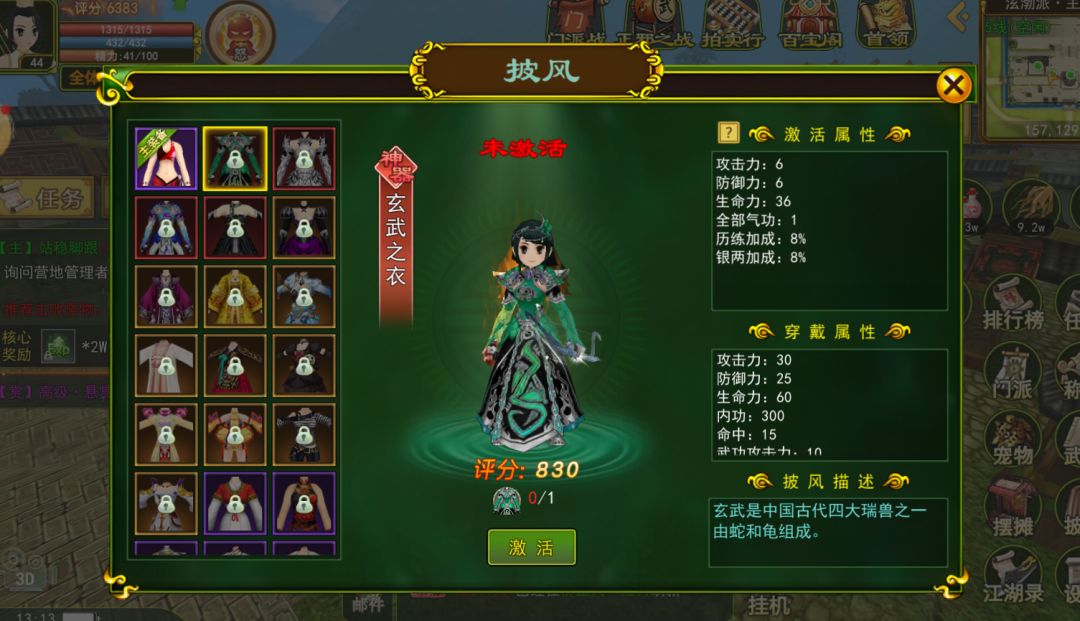 首先就是给大家说的一个披风获取气功点,首先可以买白虎披风和玄武披风,因为这两个披风激活属性都会各加一点,总共就是两点,然后活动的金龙凯的披风要买,穿戴金龙凯或者江湖路任务全部做完穿戴青龙袍,因为这两个披风的穿戴属性有气功加1,这样的话,披风就可以获得3点气功!!
