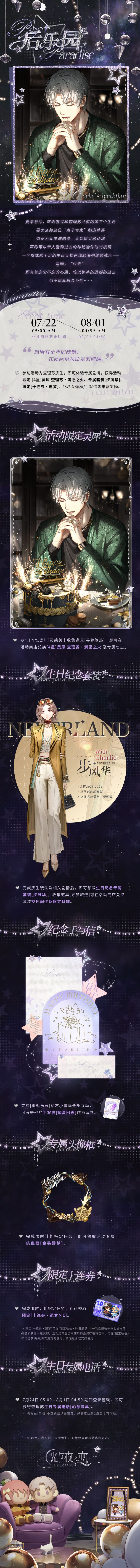 完成庆生玩法及相关剧情后,即可领取生日纪念专属套装[步风华],收集道具[寻梦旅迹]可在活动商店兑换套装换色配件及限定耳饰。