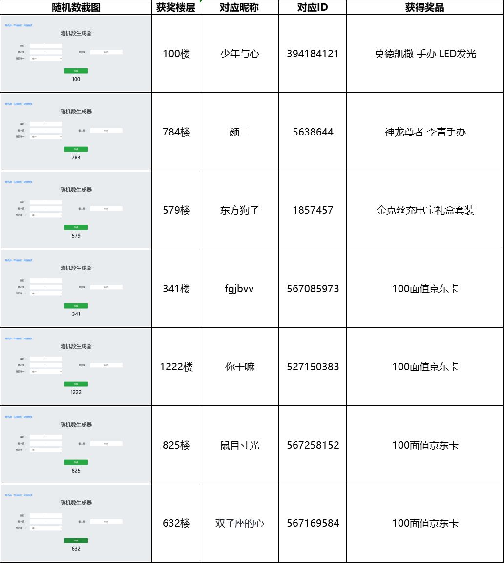 活动截至时有效楼层为1462楼,经随机数抽取获取获奖楼层和名单如下: