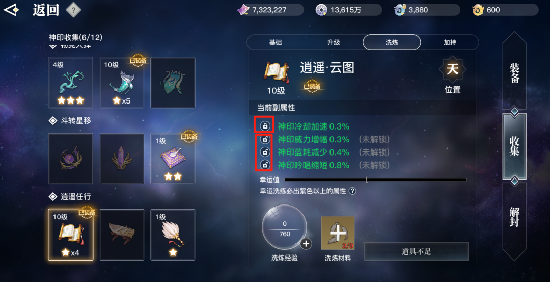 副属性词条在当前神印达到一定等级后就可以解锁,且副属性可以通过消耗对应神印的材料碎片以及经验道具【落星砂】来进行洗炼,洗炼后的副属性有机会出现更高品质。