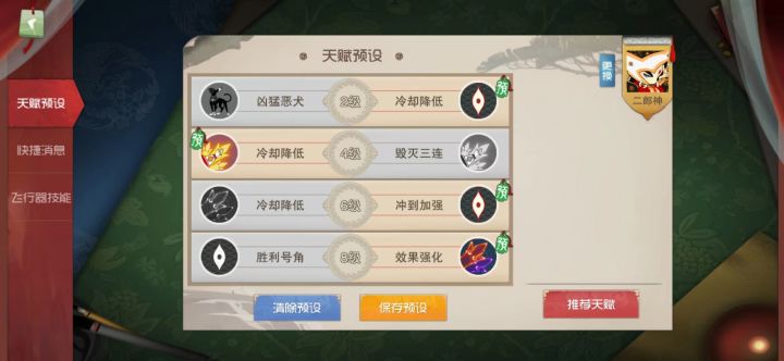 二郎神是一个十分依赖大招和二技能的英雄,大招二技能是他唯一的生存和输出手段,所以我们在加点方面我们优先点大招和二技能,二郎不需要哮天犬来打伤害,果断抛弃凶猛恶犬,毁灭三连和冷却降低,冷却降低是收益是最大的,因为二郎神的一套技能很可能打不死,这时候就需要有跑路的手段,给自己留一个后手总归是好的,冷却降低这个天赋,实际使用下来打满二技能后他的冷却只有四秒,八级的胜利号角是已经不用点的了,因为有冲到加强和冷却降低的收益,就需要一技能的普攻来补伤害了(谁能保证二郎神不用普攻呢)