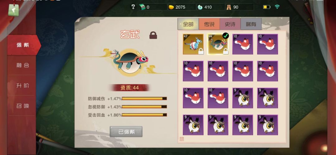 仙灵经历一次大削弱后,增加的属性微乎其微,我觉得二郎是带九尾还是玄武都没关系了,看大家喜欢哪个带哪个吧(我个人只有玄武和青龙,带的玄武)