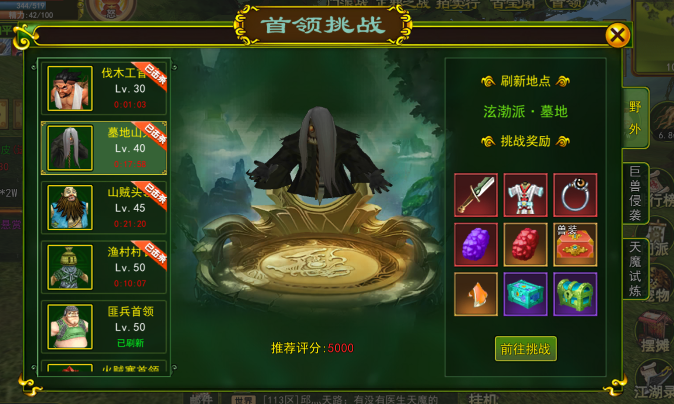 血量要求1000可以单挑但是比较废药水建议组队40级山鬼BOSS(群体大招840固定伤害)