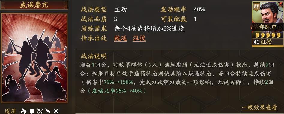 沮授的传承战法威谋靡亢,傲居顶级战法之列,传承选项上魏延也可以。无论是谁都需要耗一张好卡,但这个战法传承下来绝对值得。40%的触发概率,还是准备战法可能会凉一些人的心,但是虚弱效果一旦给敌将两人加上,那就等于直接把敌人武功给废了。再套上叛逃效果,持续性的无视防御的伤害,绝对给足了劲,只要打出来那就是无敌。