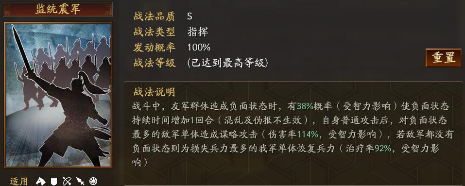 沮授的强悍更多的体现在战法的功能性上,他的自带战法监统震军具备三段功用。一是有概率延长友军造成的负面状态。除了混乱和伪报之外的所有负面效果,比如虚弱、计穷、震慑等,一旦生效那就是1变2,本来沮授自己没有控制法力,却可以借助队友的控制实现,这是全三战独一份的技能。二是对负面状态最多的敌军造成谋略伤害。伤害率114%,受智力加成影响有提升,但也不会太高,算是为主将输出核心提供的一点补充伤害。三是敌军没有负面状态时恢复己方单体兵力。这一点是补充回血技能,比华佗自带战法青囊的治疗作用略微强上那么一丢丢,相当于三分之一的刮骨疗毒。总体看,这战法在提高友军施加负面状态造成的伤害和控制效果的同时,还能对敌方造成伤害或治疗我军,“监统震军”名副其实。