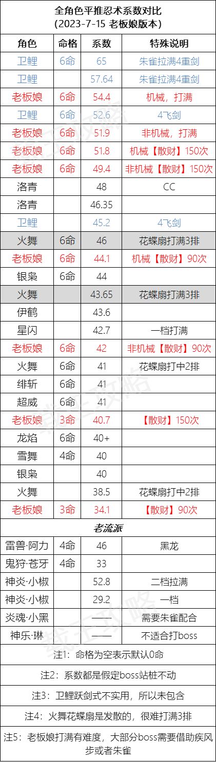 全角色强度对比及养成建议(2023-7-15老板娘版本)