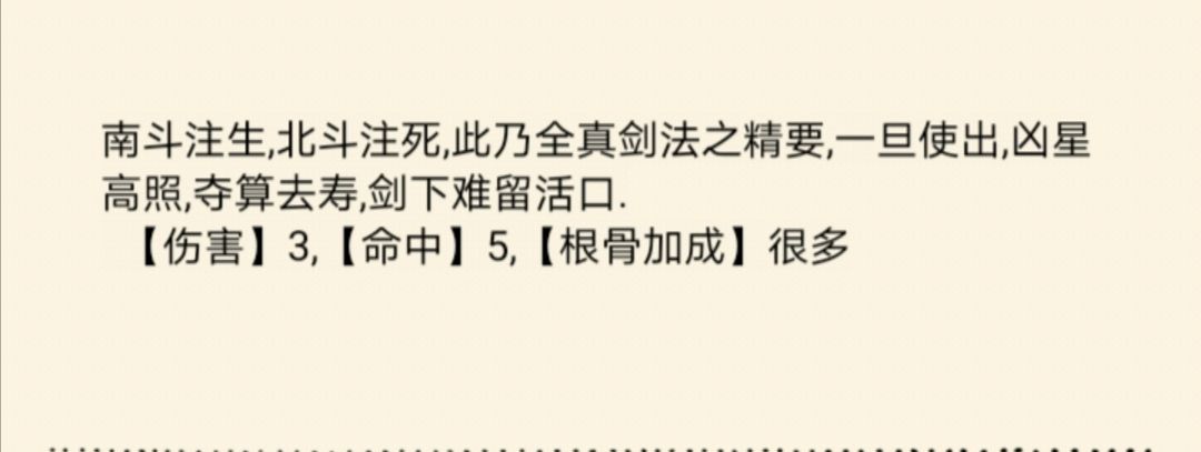 【北斗剑意】:普通直伤绝招,伤害尚可。