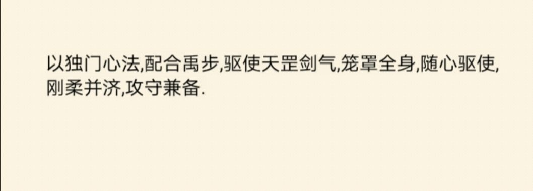 【天罡剑气】:无伤害辅助型绝招,使用后获得3层天罡剑气buff,效果为提高自身格挡 ,每回合天罡剑气buff减1,即效果可持续3回合。