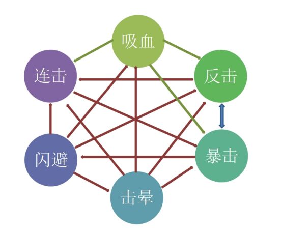 克制关系图在绝对属性条件下的克制关系图(即属性触发率100%,忽视属性皆为0%,四维属性相同【100血、20攻击、20防御、20速度】设定连击触发3次,由于吸血属性效果受属性数值上限影响,这里设定为吸血回满血也就是400%属性值)绝对克制(包括先后手)表示箭头: