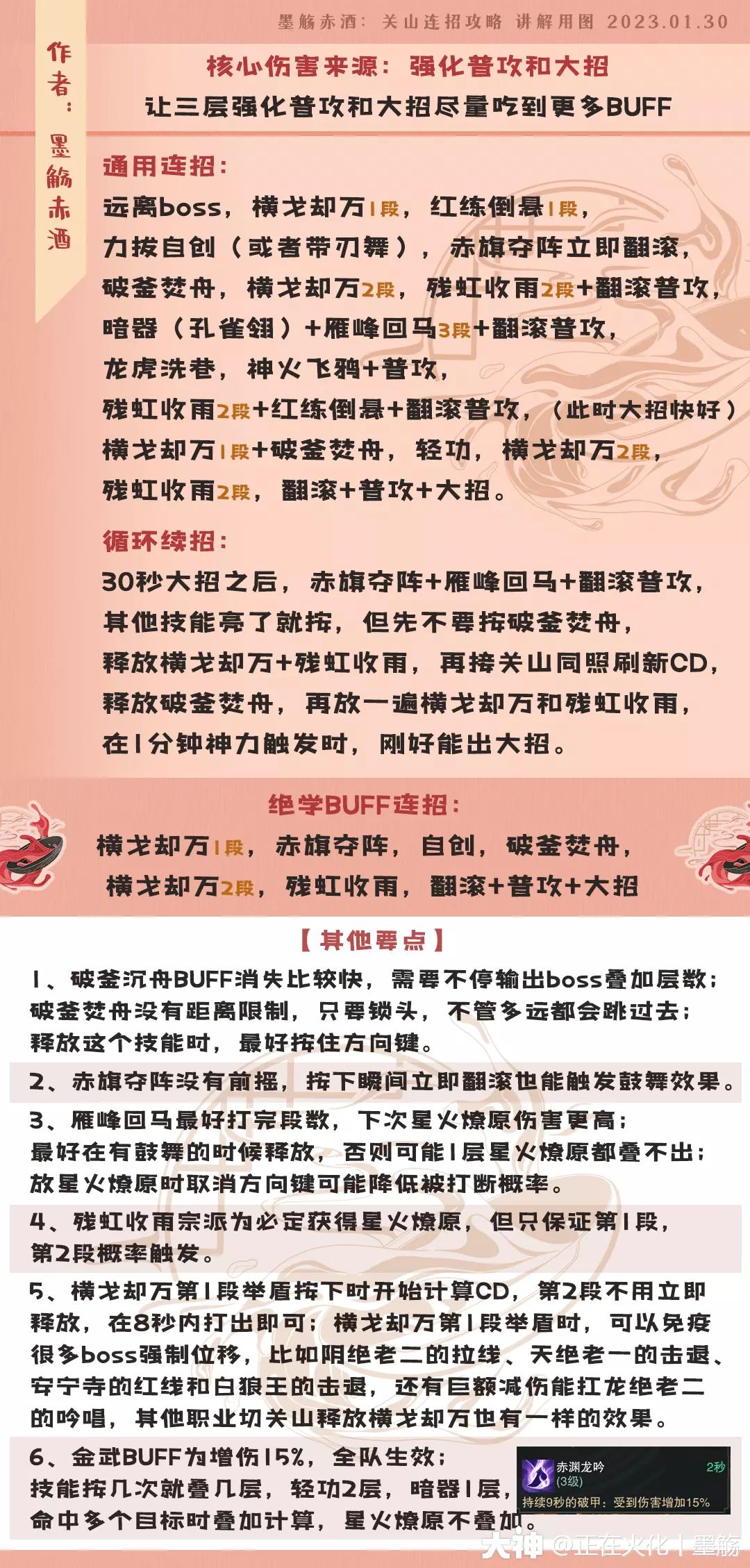 连招核心就是破釜焚舟+横戈却万+破阵曲接金鼓戎马循环,靠金鼓戎马输出。但金鼓戎马持续时间太长,不能走机制也很难转火,对环境和机制的熟悉度要求很高,而且掉血换输出奶妈压力会比较大。