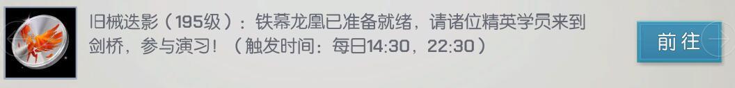 全新的世界事件【旧械迭影】将于服务器等级到达195级的部分服务器先行开启,开启时间为每日14:30和22:30,等级在190级以上的同学在参与【旧械迭影】时,可以获得高品质装备(每周一次)、兑换券“铁幕龙凰”(每周14次)等奖励。