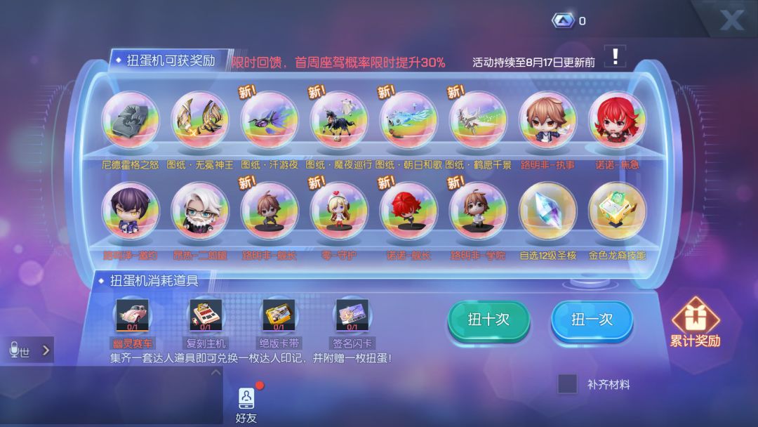 在7月20日更新后到8月17日更新前,扭蛋机将开启限时回馈,首周座驾概率提升30%!