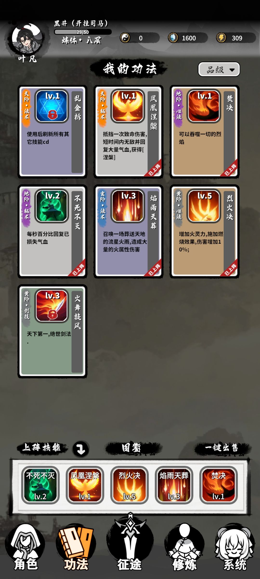 功法:刷五级焚诀重生,烈火诀>焰雨天葬>不死不灭>凤凰血脉