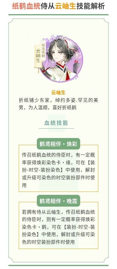 上凰国人才济济,不同血统的侍从有其种族的专属技能,有些侍从更是有属于他自身的独特技能,会在被传召时有一定概率触发。本篇就来为陛下分别介绍一下侍从云岫生的纸鹤血统技能~