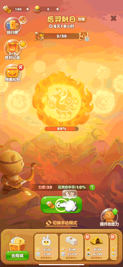 点击开始射击按钮将自动完成射箭,可使用风车币提高完美命中率、最高达到100%,使自动射击下的攻击力更高,每天都能有一次免费提升机会,通过分享求助获得。