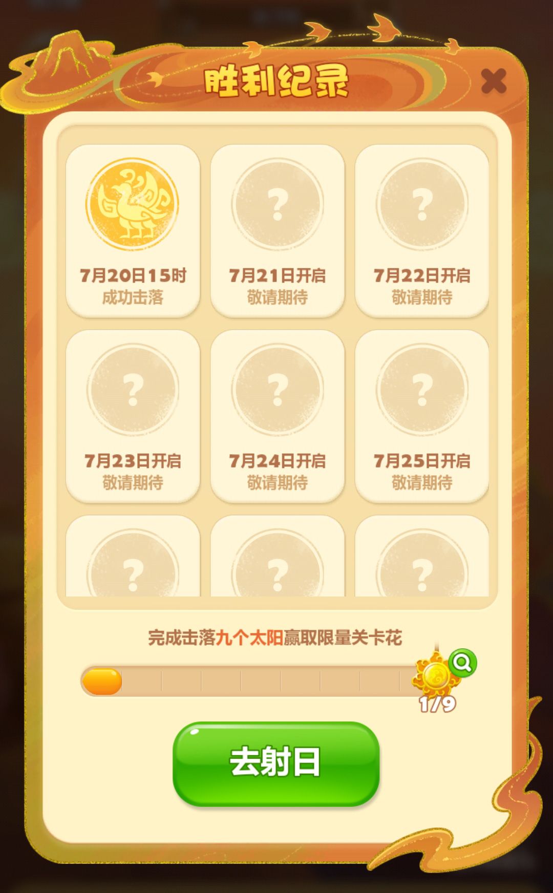 1、太阳神鸟关卡花:集齐全部胜利纪录可获得