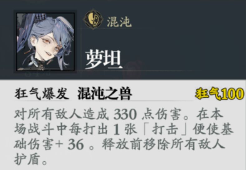 总而言之,萝坦不会争夺及消耗队伍的资源,如有必要甚至可以卖出她的「防御」牌或「恣睢之浪」牌等,甚至在决战之前的最后一个机会再进行觉醒也不迟。而「打击」、「桀骜之刃」、「混沌之兽」则会在发育过程中给队伍提供强而有力的支撑,特别是在第三章主线剧情的时候,地图机制会保证第一回合可以觉醒,简直无情。