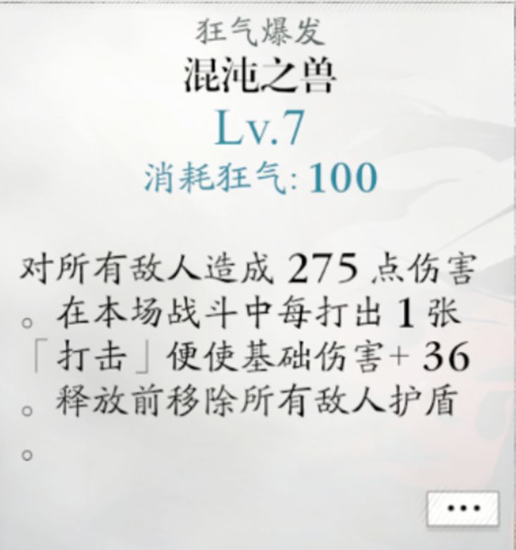 {狂气消耗100} 对所有敌人造成1.84Atk点伤害。在本场战斗中每打出一张「打击」便使得基础伤害增加0.2392Atk点。【释放前移除所有敌人护盾】